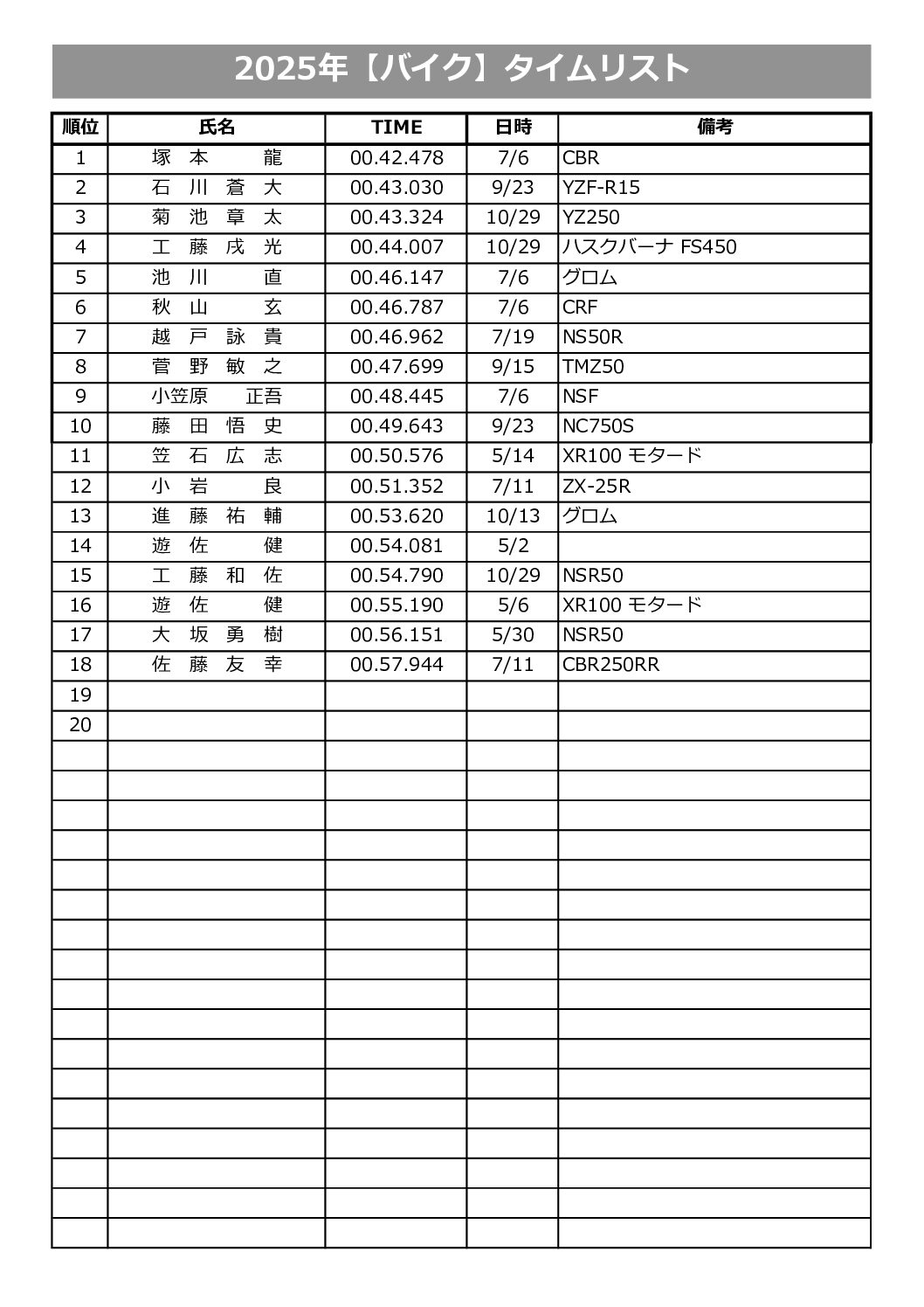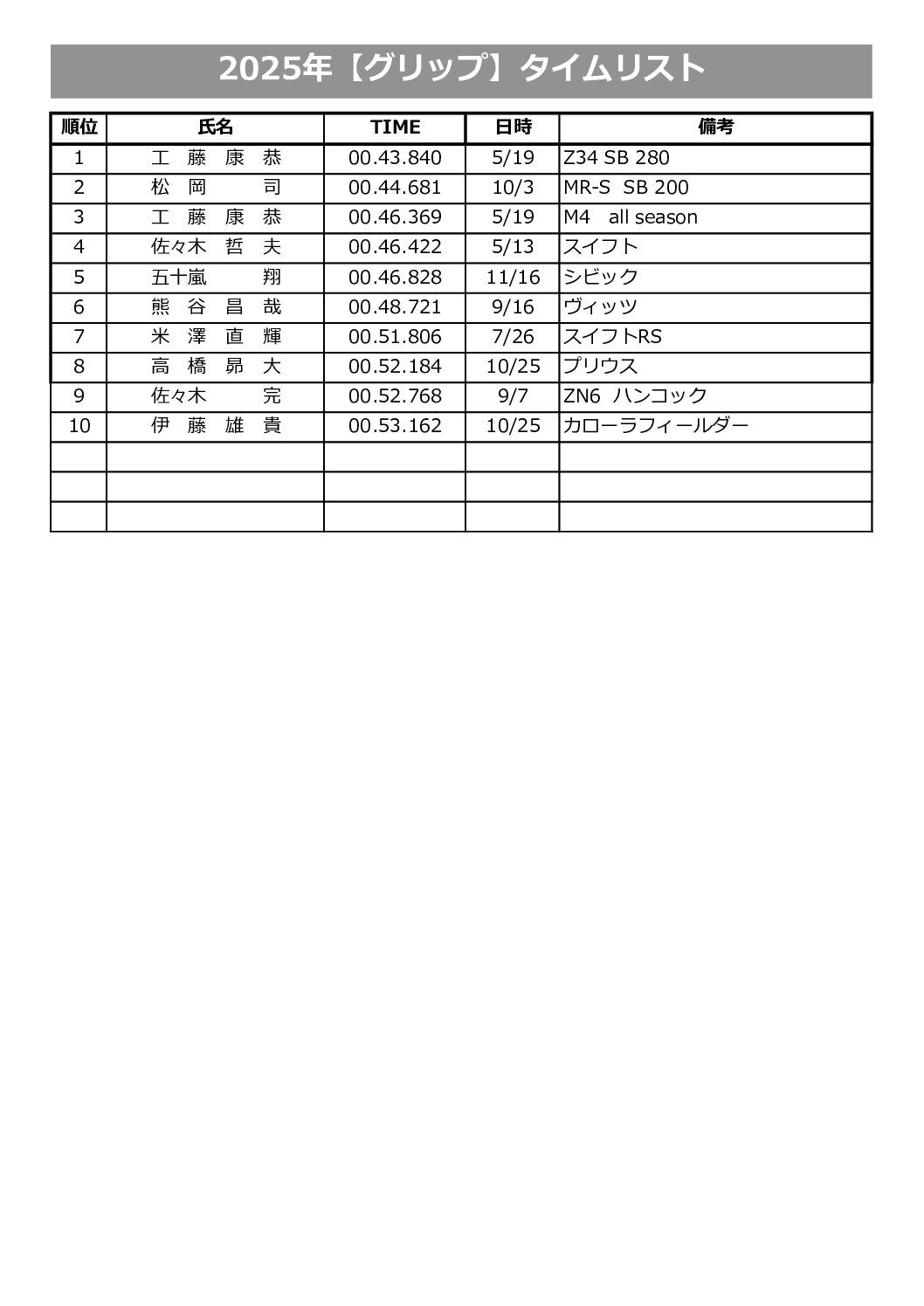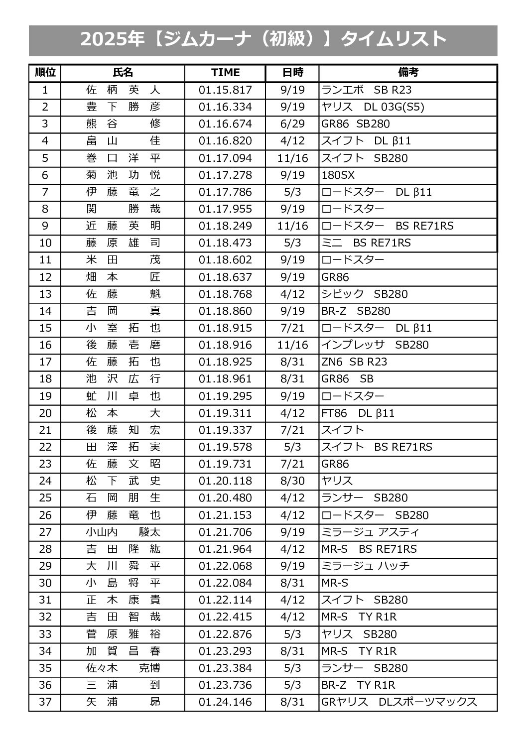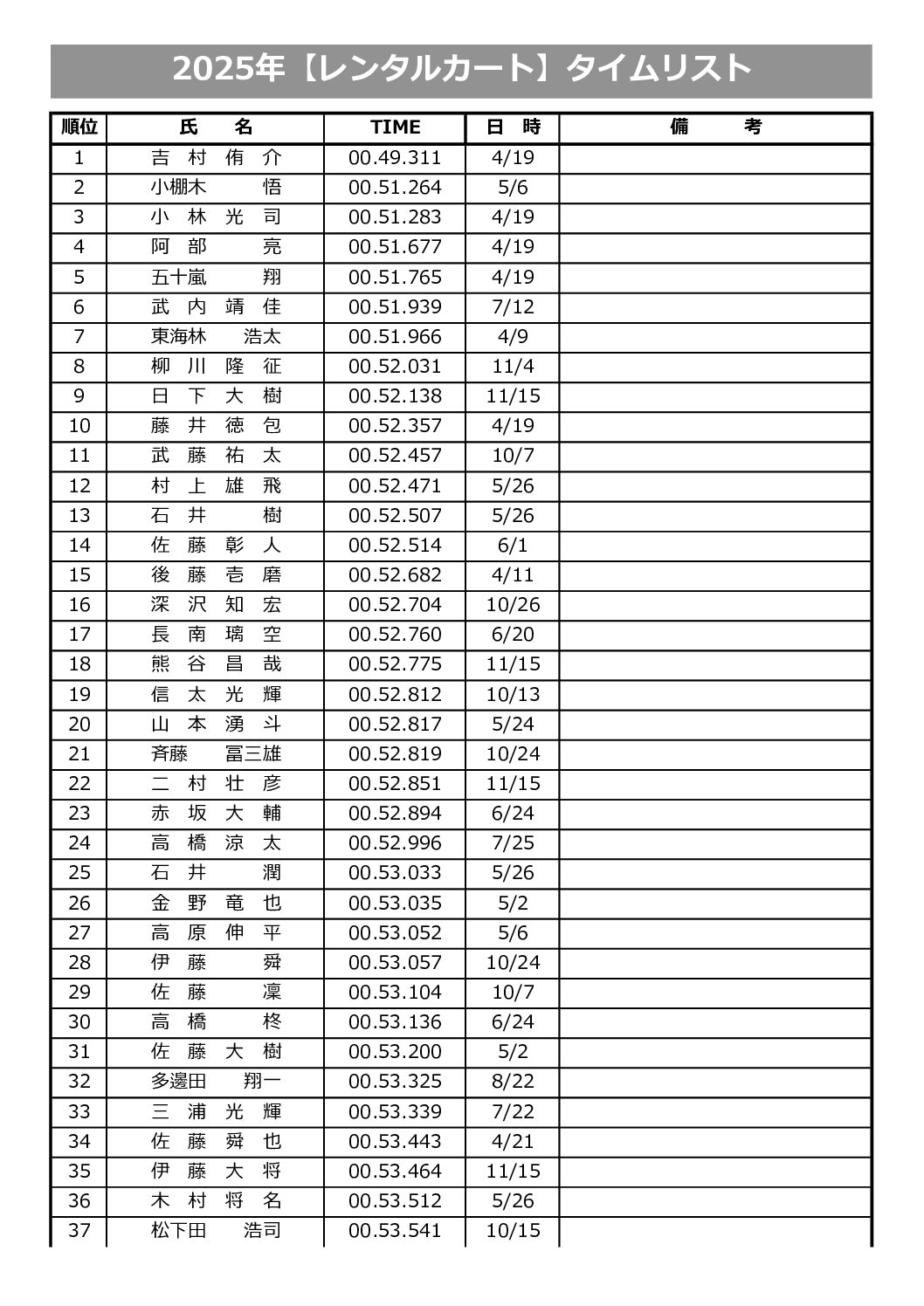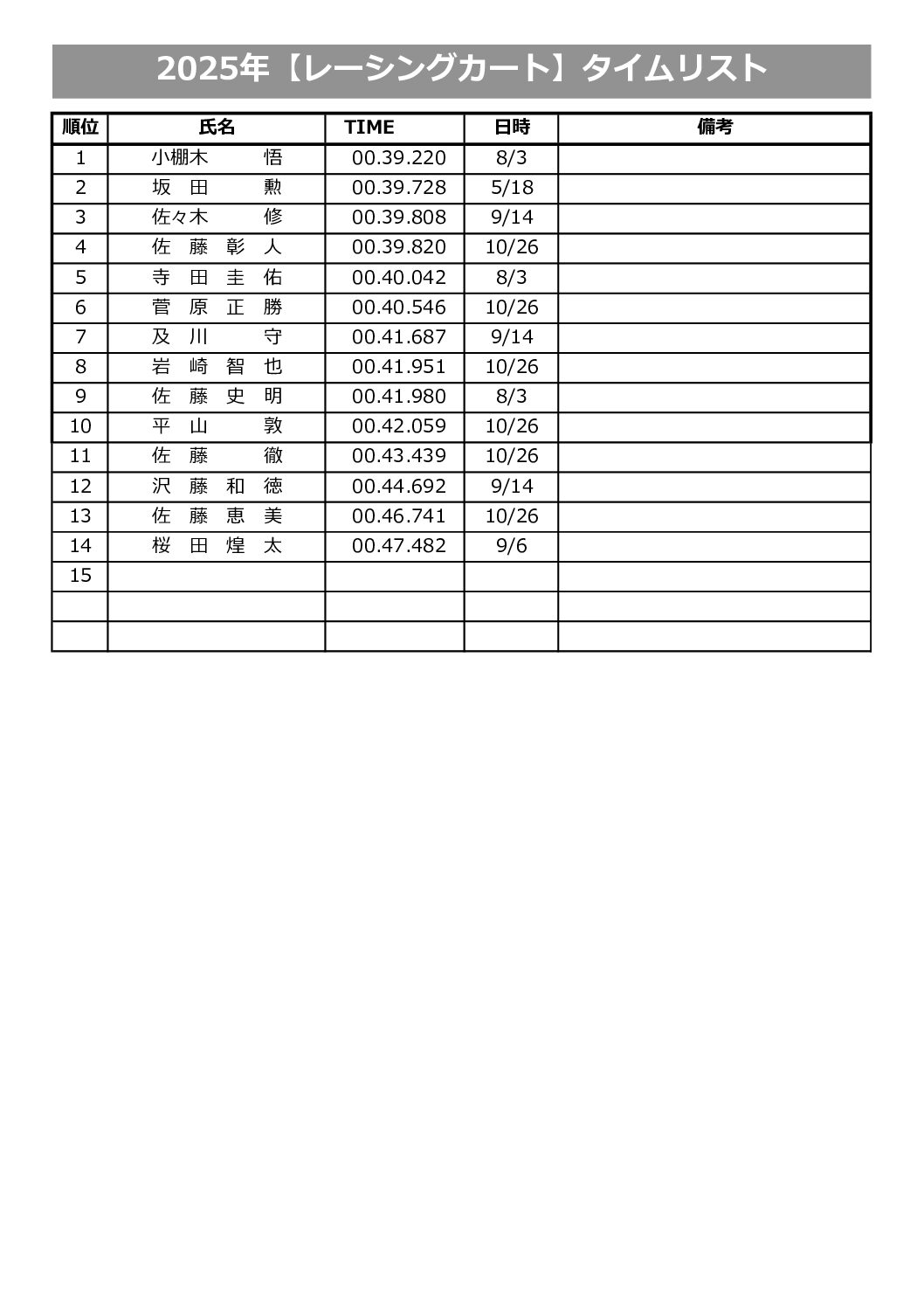 新協和カートランドで設定したコースでのタイムランキングです。
